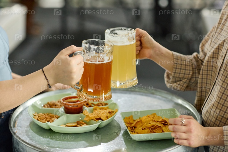 Молодые взрослые женщины стучат пивные бокалы, наслаждаясь закусками в помещении