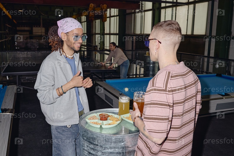 Молодые взрослые мужчины общаются и пьют пиво возле бильярдного стола в помещении