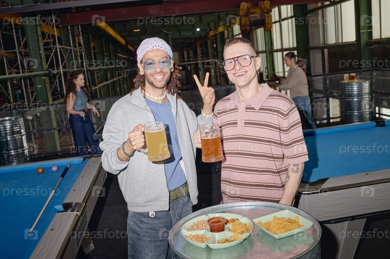 Разнообразные молодые взрослые друзья-мужчины наслаждаются пивом и закусками в бильярдном клубе