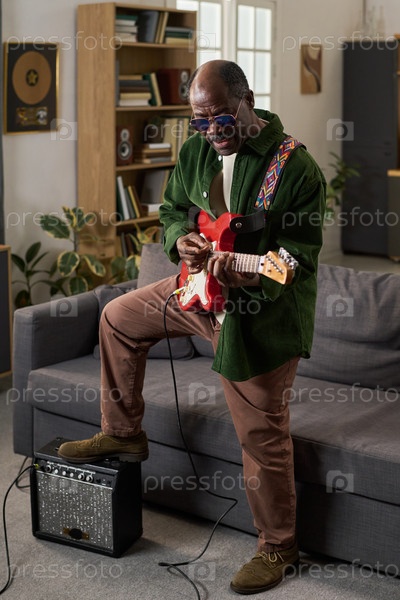 Чёрный мужчина играет на электрической гитаре Стоя возле усилителя Senior Indoors