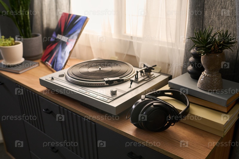 Винтажный проигрыватель, играющий виниловую запись с наушниками на деревянной боковой доске