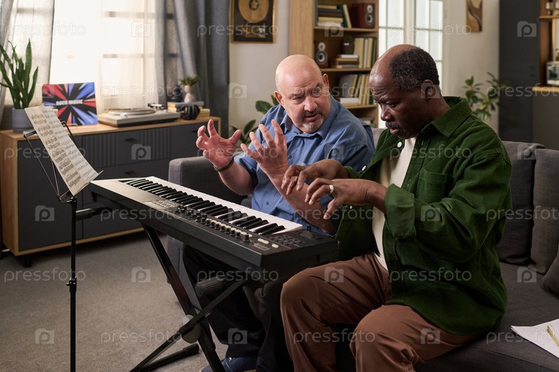 Кавказский мужчина средних лет учит старшего чернокожего человека играть на электронной клавиатуре