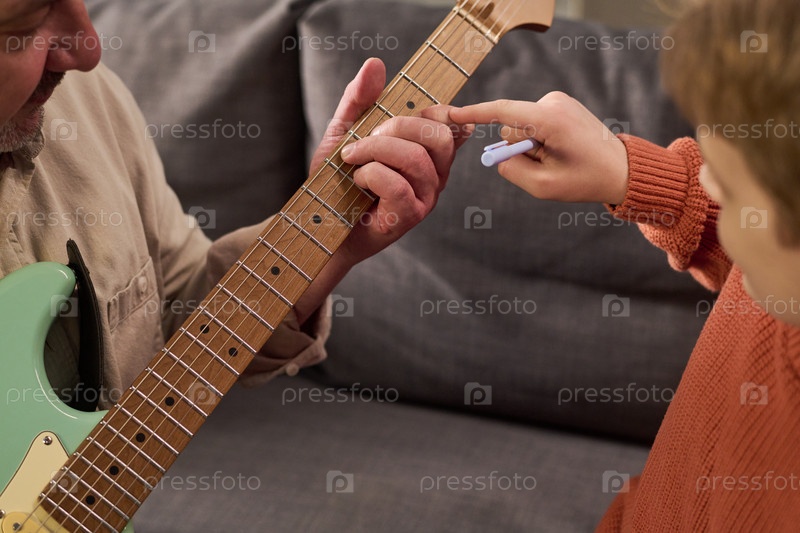 Кавказский мужчина средних лет учит ребенка играть на электрической гитаре в помещении