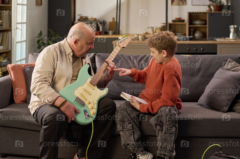 Старший кавказский мужчина обучает молодого белого мальчика технике электрогитары