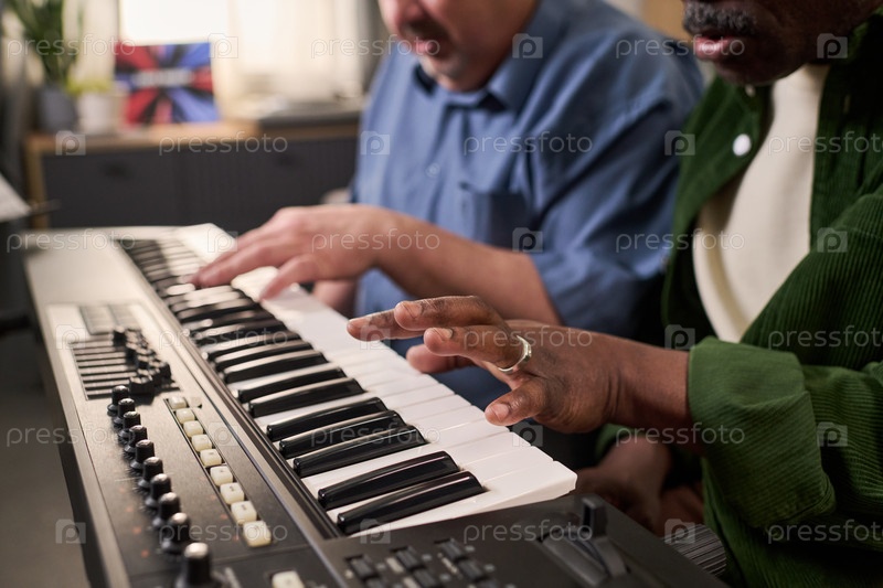 Кавказский мужчина средних лет и чернокожий человек играют на электронной клавиатуре вместе