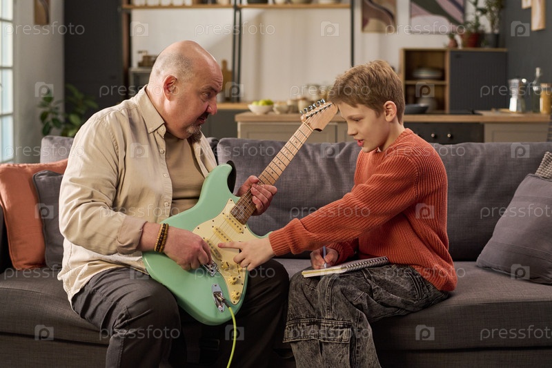 Кавказский мужчина среднего возраста учит мальчика-белого пола играть на электрической гитаре