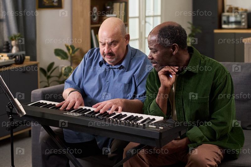 Старший чернокожий мужчина наблюдает за средних лет белый человек демонстрирует клавиатуру