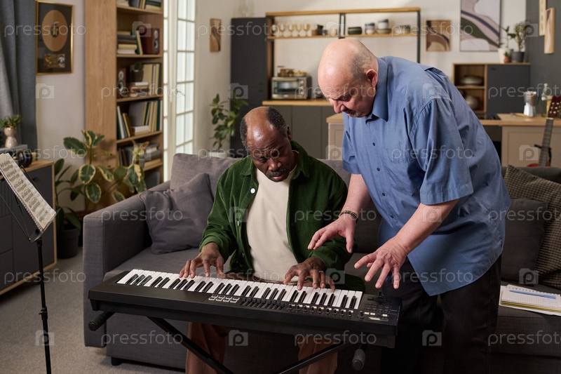 Чернокожий мужчина среднего возраста практикует фортепиано, в то время как белый человек средних лет преподаёт