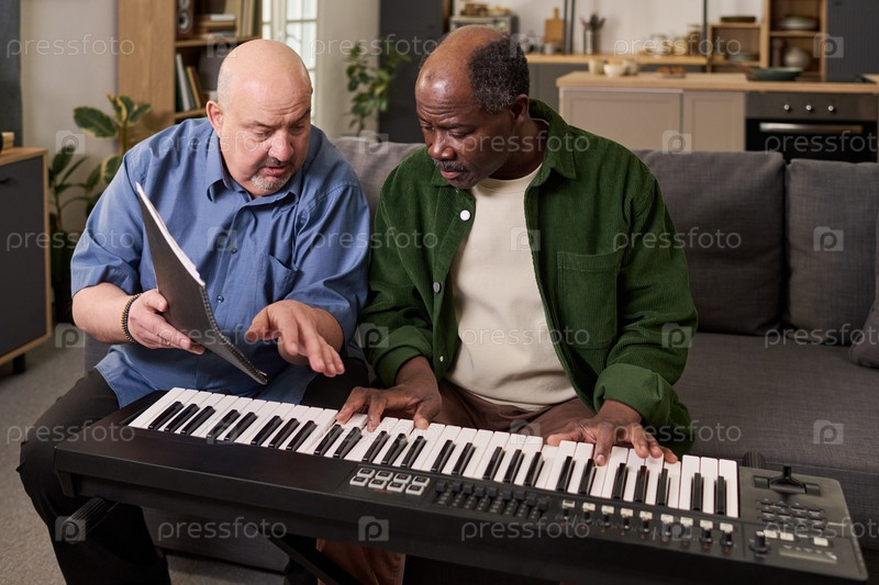 Черный мужчина учится на электронной клавиатуре у старшего кавказского человека среднего возраста