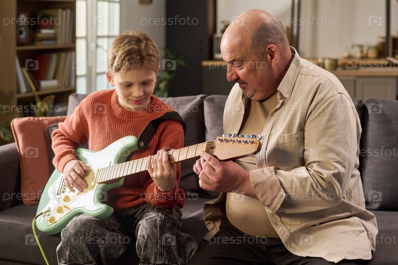 Кавказский мужчина учит старшего ребенка мальчика играть на электрической гитаре в помещении