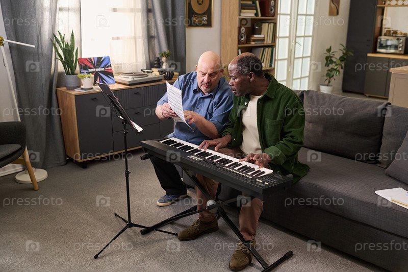 Чернокожий мужчина получает музыкальное обучение от старшего кавказского мужчины среднего возраста в помещении