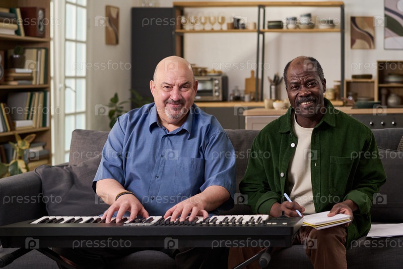 Кавказский мужчина средних лет играет на клавиатуре рядом с чернокожим человеком средних лет, который пишет