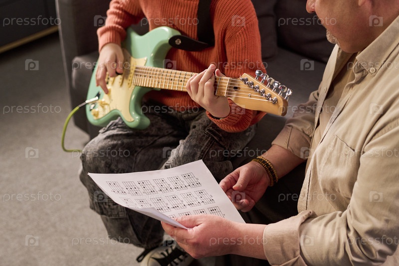 Девушка-подросток практикуется на электрической гитаре с кавказским мужчиной среднего возраста, преподающим