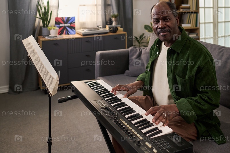 Портрет старшего чернокожего человека, играющего на электронной клавиатуре в гостиной