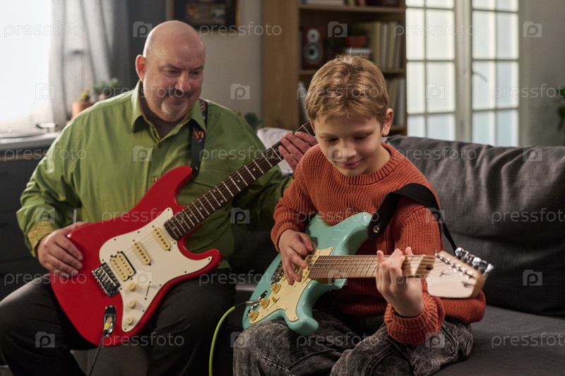 Кавказский мужчина средних лет учит кавказского мальчика играть на электрической гитаре