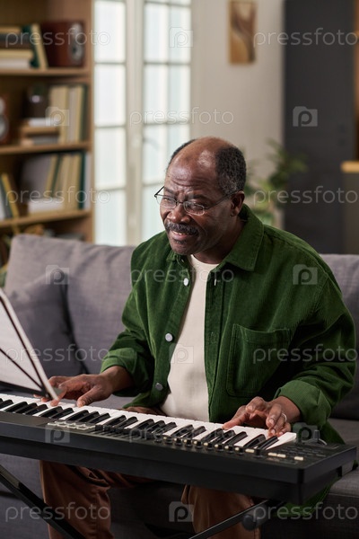 Чёрный мужчина играет на электронной клавиатуре и улыбается в помещении
