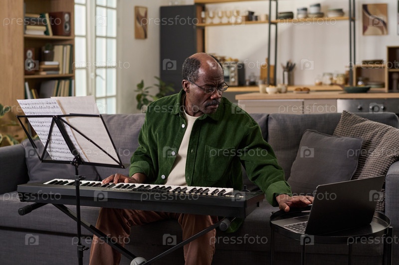 Чернокожий мужчина средних лет играет на клавиатуре, используя ноутбук в гостиной