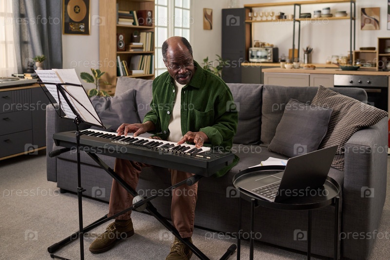 Чернокожий мужчина играет на клавиатуре, посещая онлайн-музыкальный урок Senior