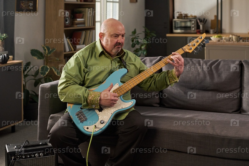 Кавказский мужчина средних лет играет на электрической бас-гитаре, сидя в помещении