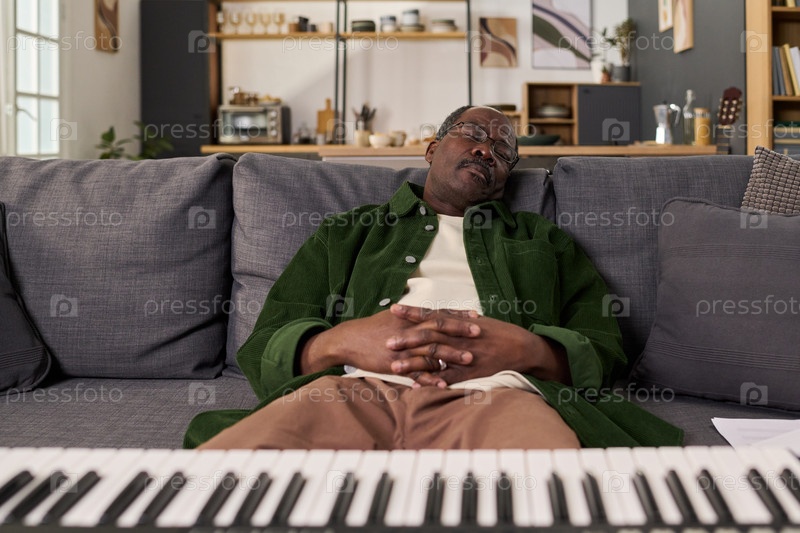 Чёрный мужчина средних лет, отдыхающий на диване за цифровым пианино в гостиной