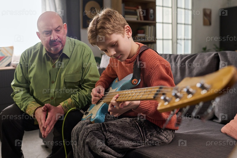 Кавказский мальчик играет на электрической гитаре, в то время как мужчина среднего возраста внимательно наблюдает