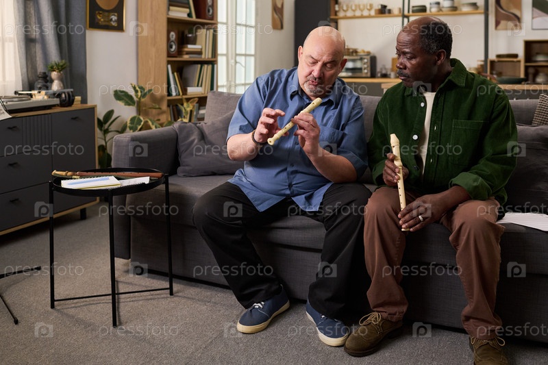 Кавказский мужчина среднего возраста преподает чернокожему мужчине среднего возраста играть в рекордер