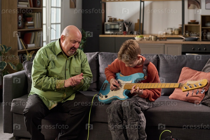 Старший кавказский мужчина наблюдает за молодым мальчиком, практикующим электрическую бас-гитару