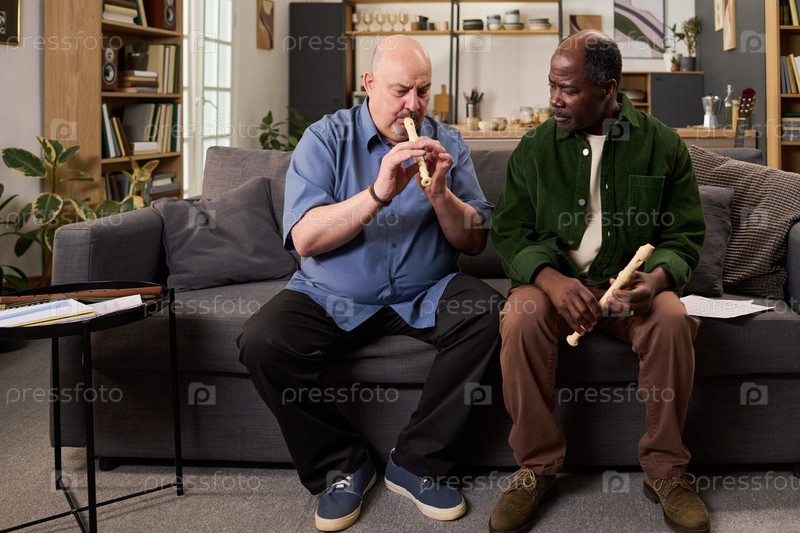 Старший кавказский мужчина преподает среднего возраста чернокожему мужчине, играющему на звукозаписывающем устройстве в помещении