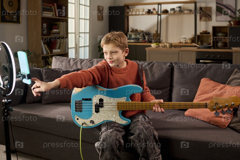 Caucasian Preteen Boy играет на электрической бас-гитаре, записывая видео