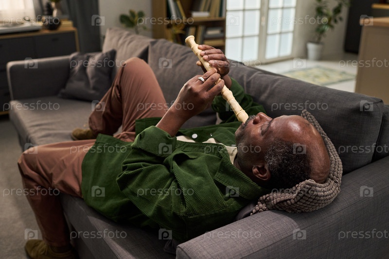 Чернокожий мужчина среднего возраста, лежащий на диване и играющий на деревянной флейте в помещении
