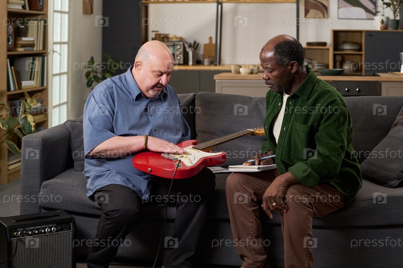 Кавказский мужчина среднего возраста преподает чернокожему мужчине средних лет играть на электрической гитаре