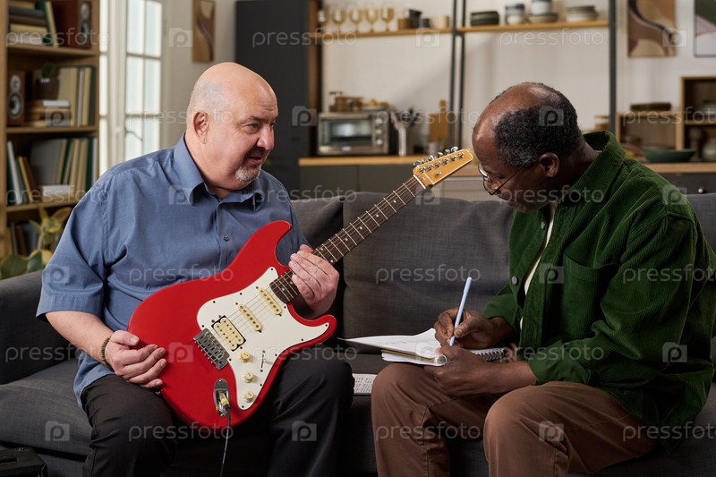Кавказский мужчина среднего возраста преподает старшему черному человеку играть на электрической гитаре