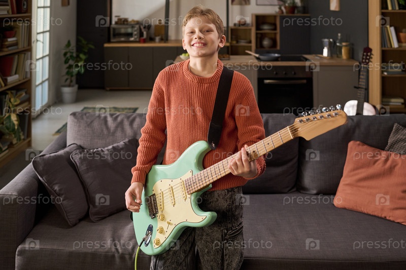Портрет белого мальчика-подростка, улыбающегося во время игры на электрической гитаре в помещении