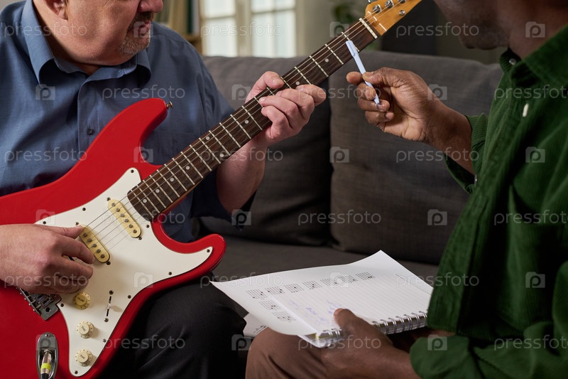 Кавказский мужчина средних лет играет на электрической гитаре, в то время как чернокожий человек делает заметки