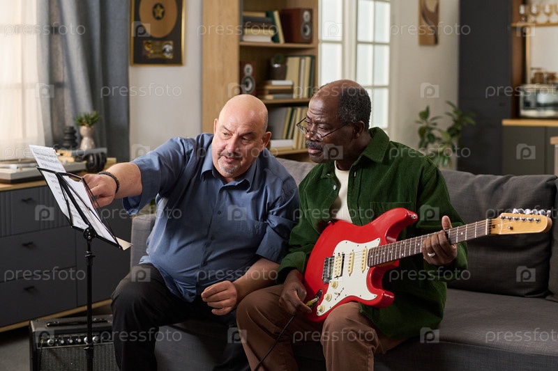 Чернокожий мужчина следует за старшим кавказским мужчиной среднего возраста, объясняющим гитарные ноты