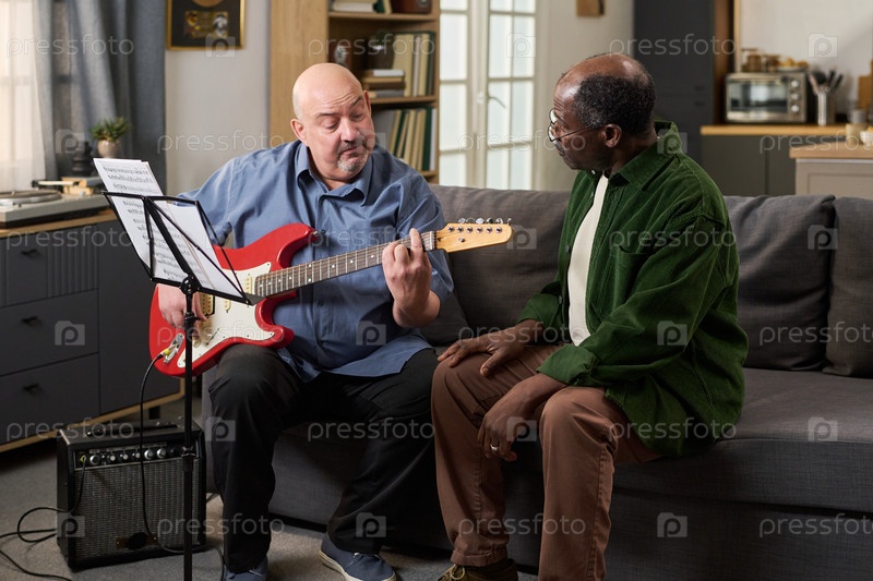 Кавказский мужчина средних лет демонстрирует аккорды гитары старшему черному мужчине в помещении