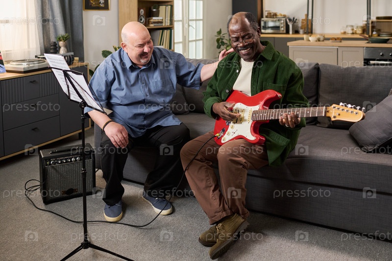 Кавказский мужчина средних лет поощряет старшего чернокожего человека играть на электрической гитаре