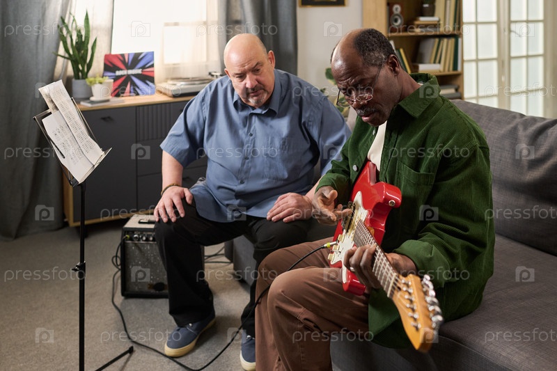 Кавказский мужчина средних лет учит старшего чернокожего человека играть на электрической гитаре