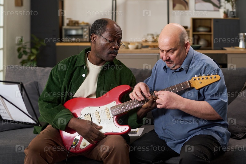 Старший чернокожий мужчина практикует аккорды для гитары со средневековым кавказским наставником