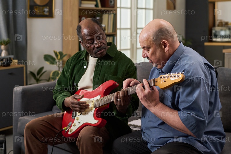 Старший чернокожий мужчина практикует электрическую гитару с помощью техники руководства кавказского наставника