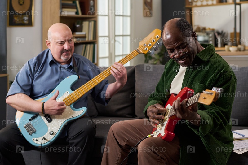 Кавказский мужчина средних лет и старший чернокожий человек вместе играют на электрической гитаре