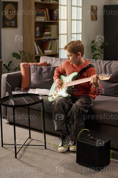 Кавказский мальчик играет на электрической гитаре, пока смотрит онлайн-уроки в помещении