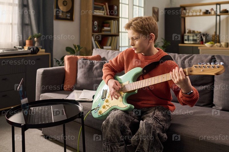 Кавказский юноша играет на электрической гитаре, пока смотрит онлайн-уроки