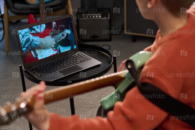Подросток-кавказский мальчик учится играть на гитаре, смотря онлайн видеоуроки
