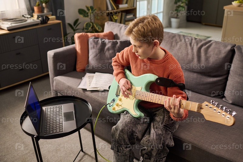 Кавказский мальчик в подростковом возрасте практикует электрическую гитару, следуя инструкции по ноутбуку