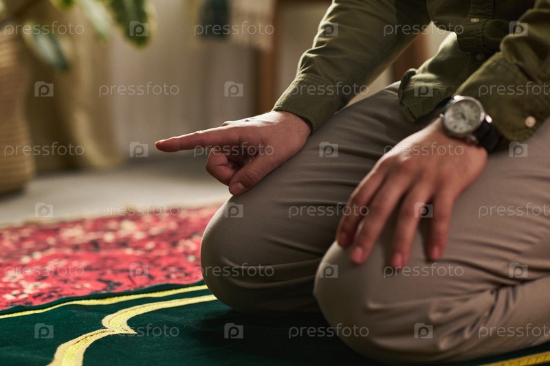 Молодой взрослый мусульманин молится на ковре и показывает пальцем во время молитвы