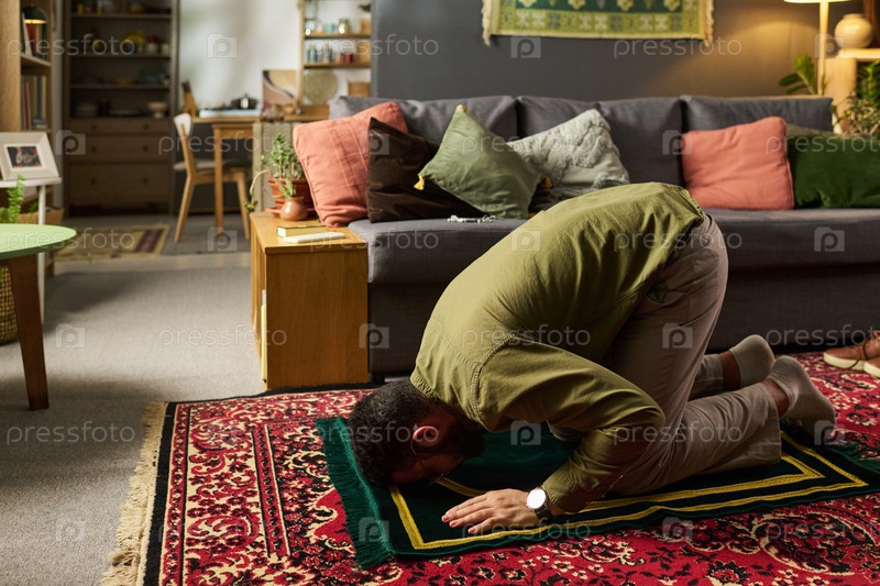 Молодой взрослый мусульманин молится на ковре в гостиной во время богослужения