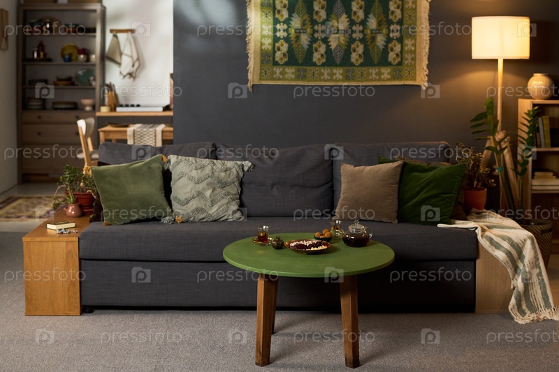 Гостиная с зеленым кофейным столом и традиционными современными мусульманскими закусками