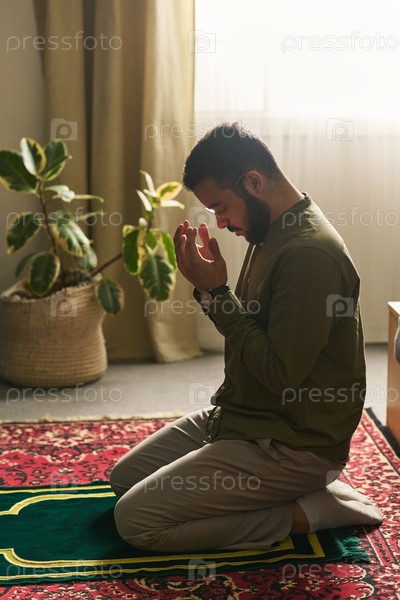 Молодой взрослый мусульманский мужчина молится в помещении Коленопреклонение на молитвенном ковре днем