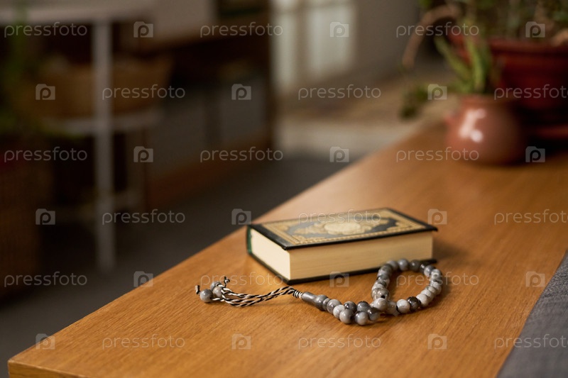 Исламские молитвенные бусы и Коран, отдыхающие на деревянном столе в помещении